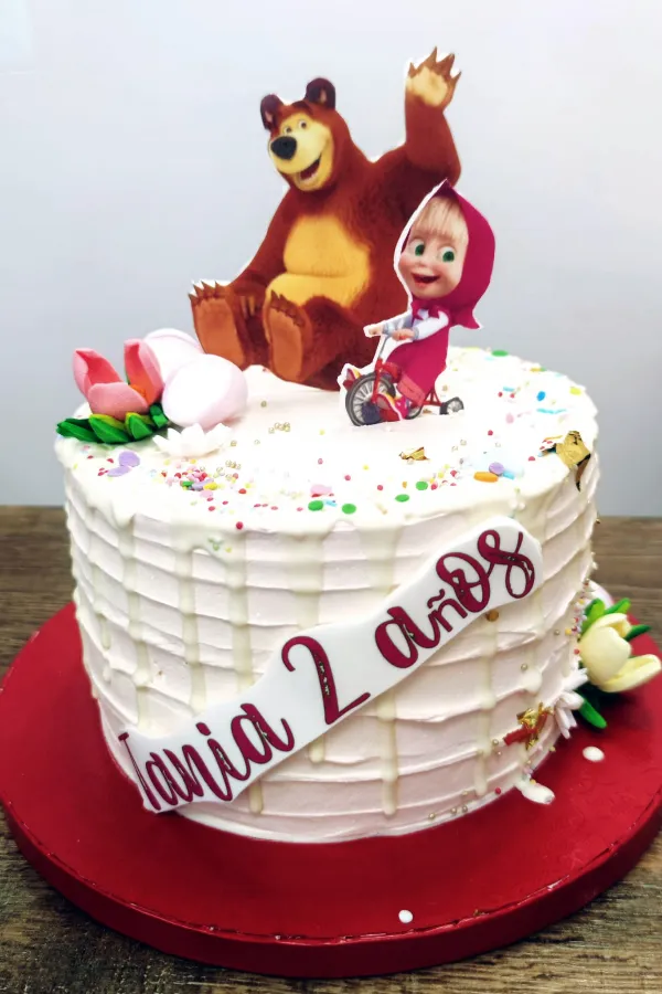 Ideal para cumpleaños de los más traviesos, esta tarta artesanal combina diversión infantil con un diseño limpio y moderno que encanta también a los adultos. El contraste del blanco con los colores alegres de Masha crea una pieza central visualmente impactante. Personalízala con el nombre de tu pequeño torbellino y detalles del Oso para completar la historia de esta amistad adorable.